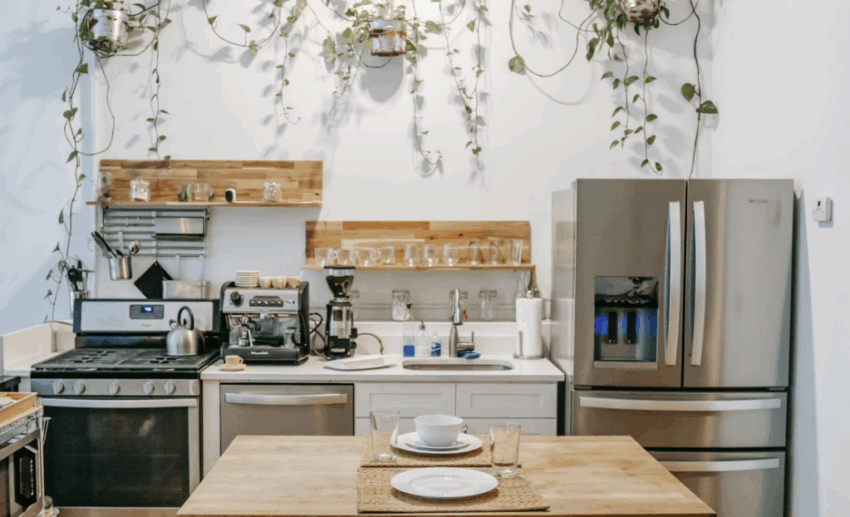 If you have a small corner or unused area, a floor plant stand with a large fiddle leaf fig tree is an excellent addition. The leaf shapes add drama and movement. This gives your kitchen a new look with very little effort.