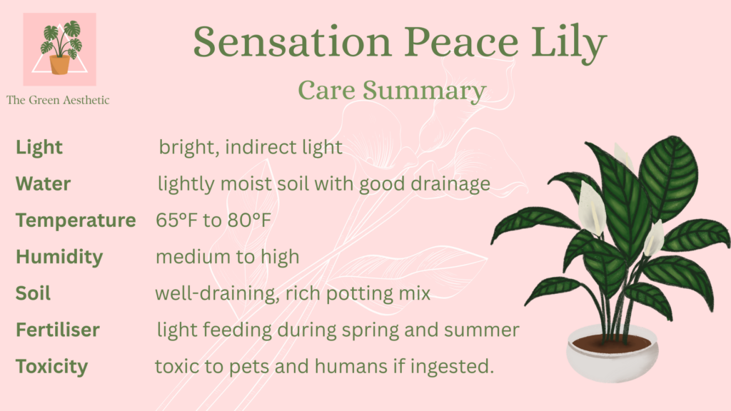 The sensation peace lily prefers bright indirect light. This supports strong leaves and regular blooms. East-facing windows are a great option. A west window also works with filtered light.